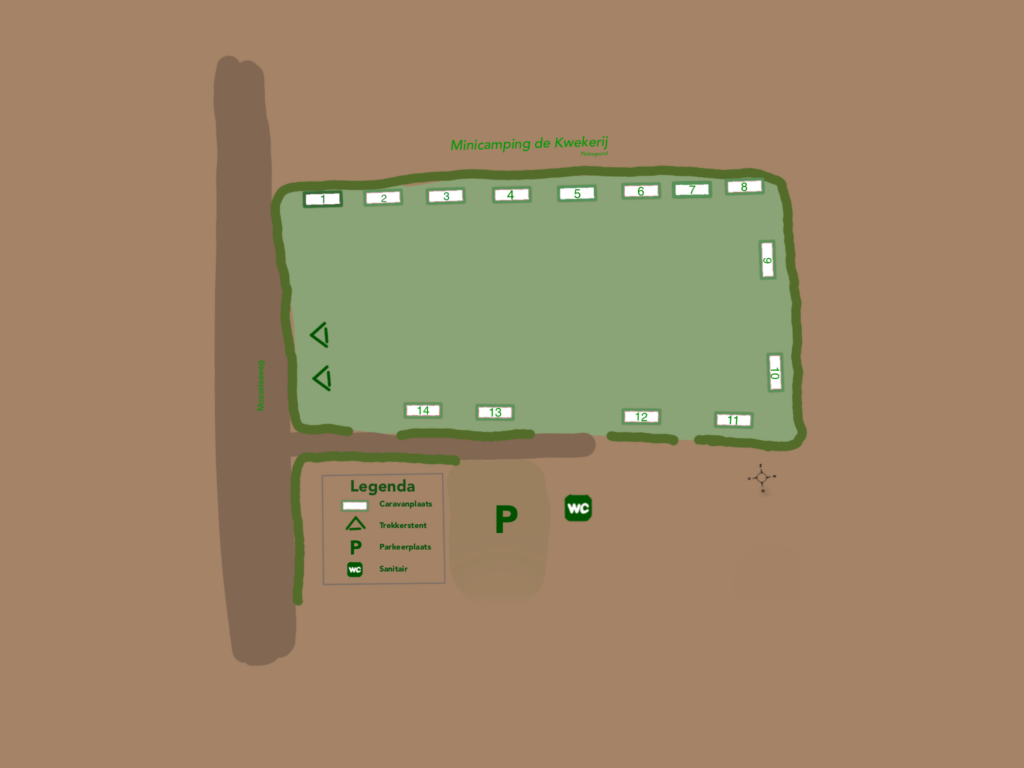 Het kampeerveld heeft 14 ruime plaatsen met een elektra-aansluiting. Daarnaast is er nog ruimte voor een paar trekkerstentjes. Kijk op de plattegrond om een indruk te krijgen van de indeling van onze minicamping.