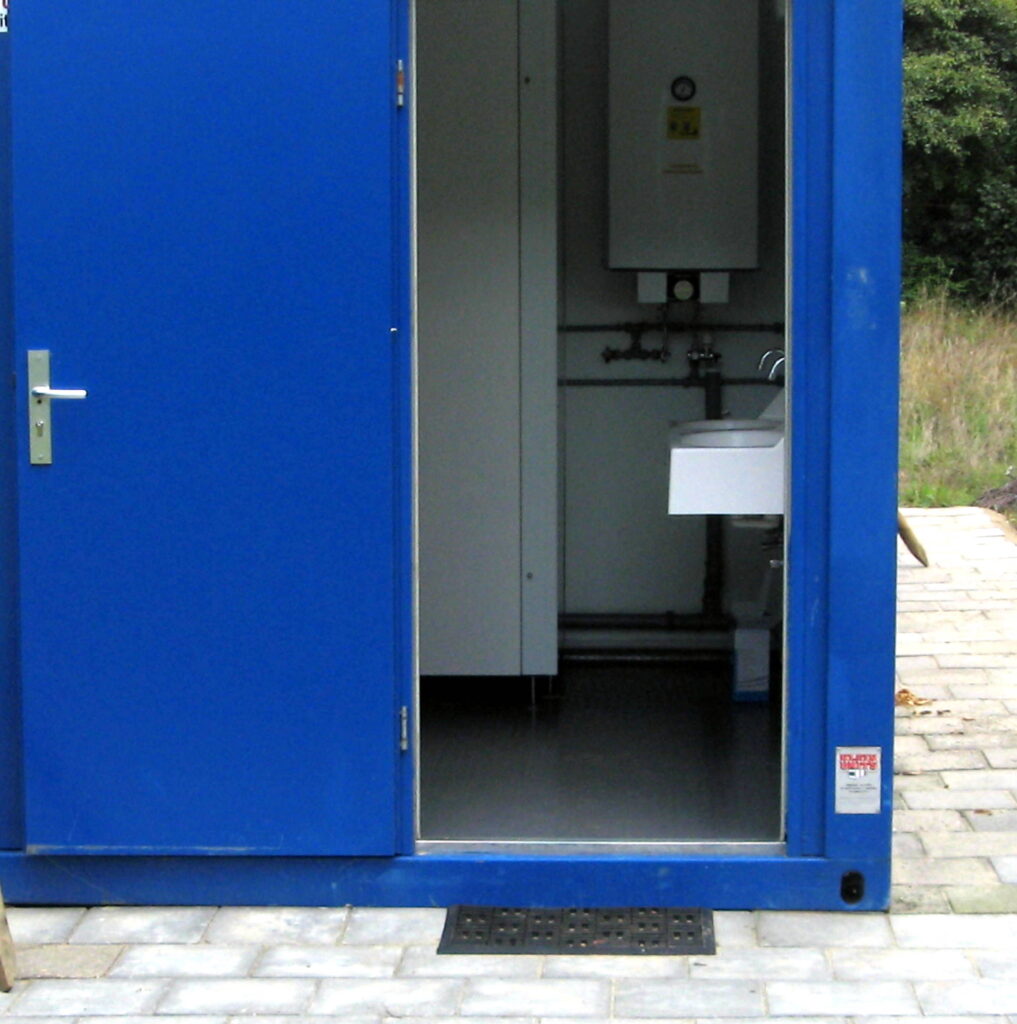 Naast de schuur hebben we twee units geplaatst met douches, wasbakken met koud/warm water, toiletten en een urinoir. In iedere unit hangt een elektrisch kacheltje. Tussen de units is gelegenheid voor afwas, kleine wasjes of andere schoonmaakklusjes. Achter de units bevindt zicht een stortbak voor het ledigen van het chemisch toilet. De sanitaire voorzieningen worden overdekt door een zogenaamde wandelkap. Dat is een mobiele tunnelkas die gebruikt wordt in de tuinbouw. De wandelkap zorgt voor beschutting en privacy.